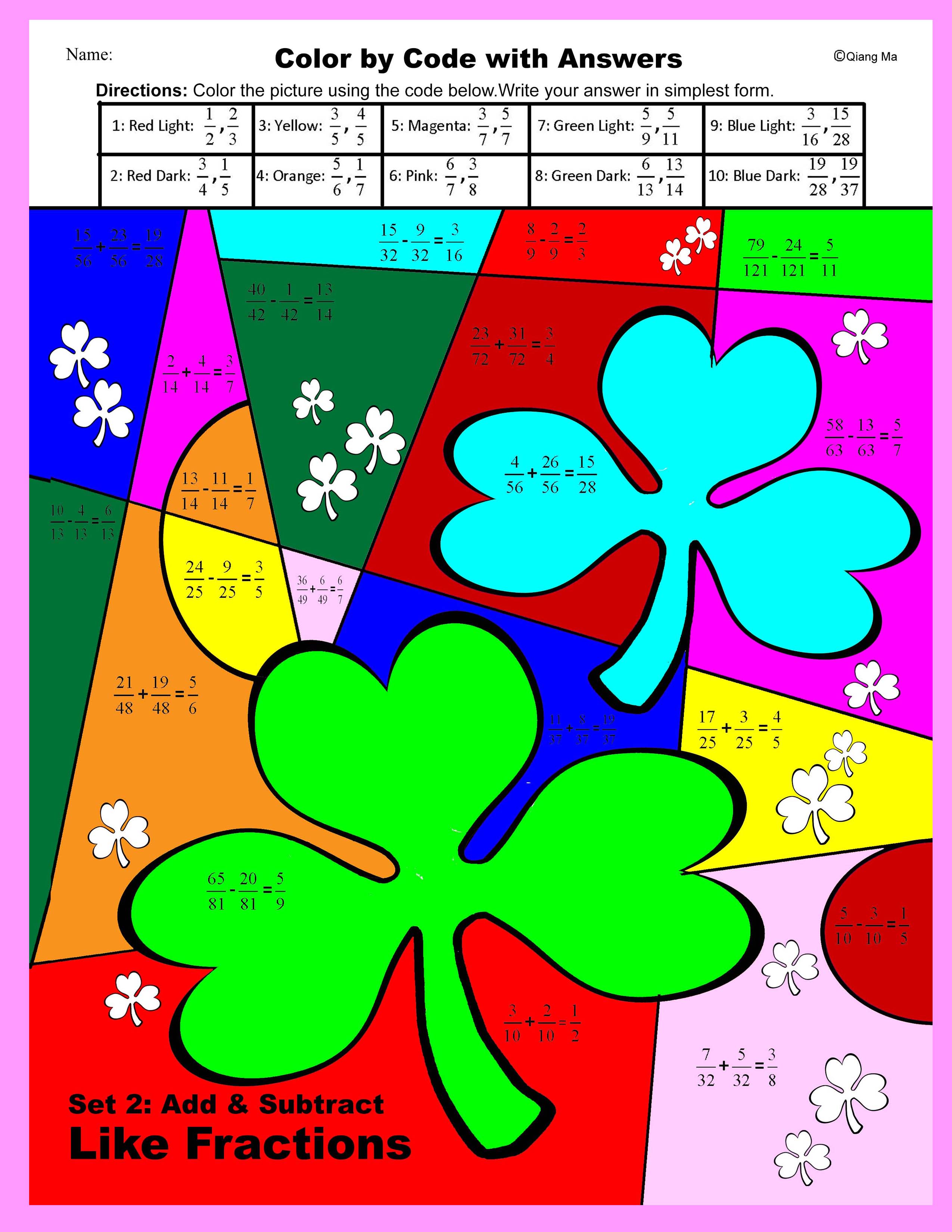 This St. Patrick's Day Add & Subtract Like Fractions set includes a student’s version and a teacher’s version. They are 20 problems total. All positive fractions. Grade 3-10. Use for St. Patrick's Day, or any time of the year. Prep Free! Independent!