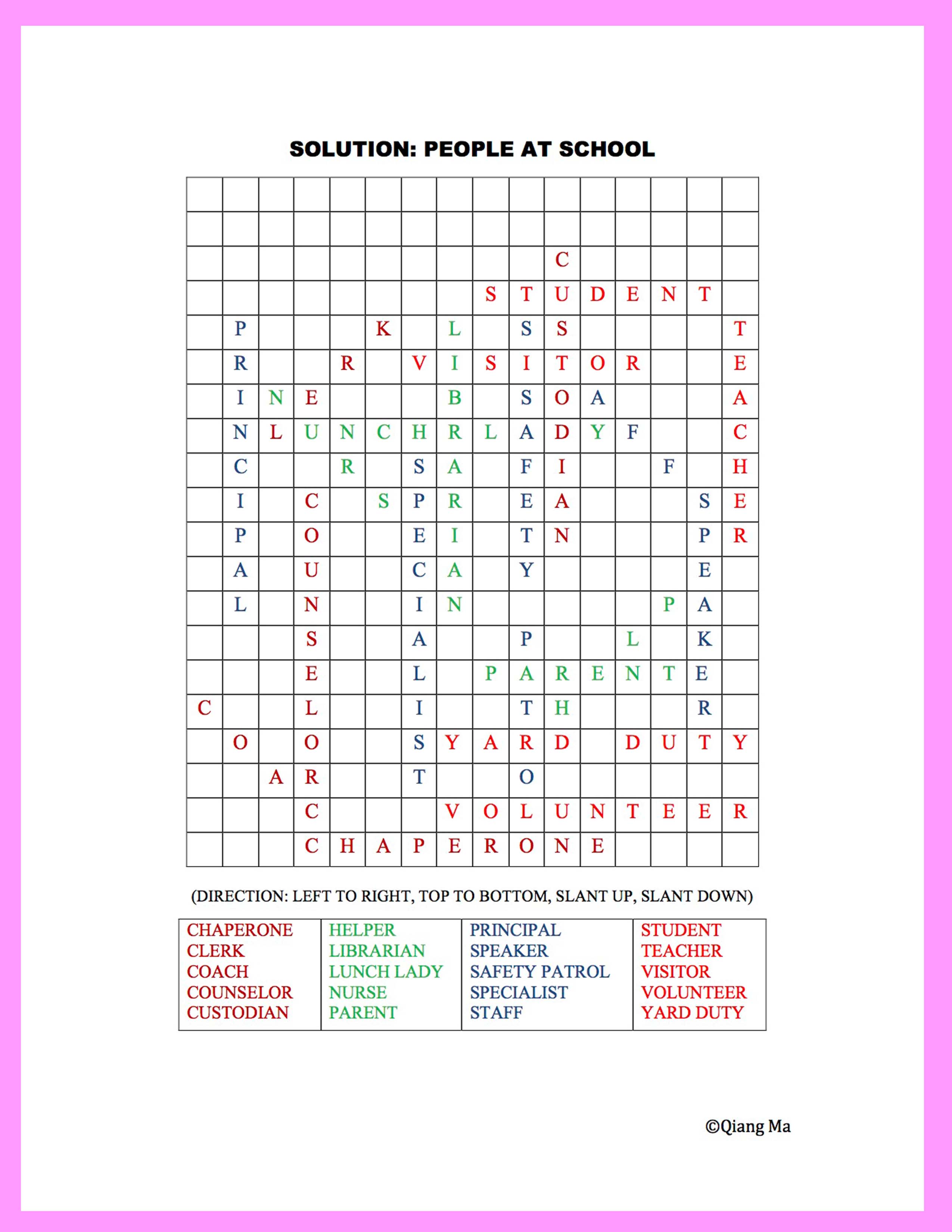 CHAPERONE, CLERK, COACH, COUNSELOR, CUSTODIAN, HELPER, LIBRARIAN, LUNCH LADY, NURSE, PARENT, PRINCIPAL, SPEAKER, SAFETY PATROL, SPECIALIST, STAFF, STUDENT, TEACHER, VISITOR, VOLUNTEER, YARD DUTY
