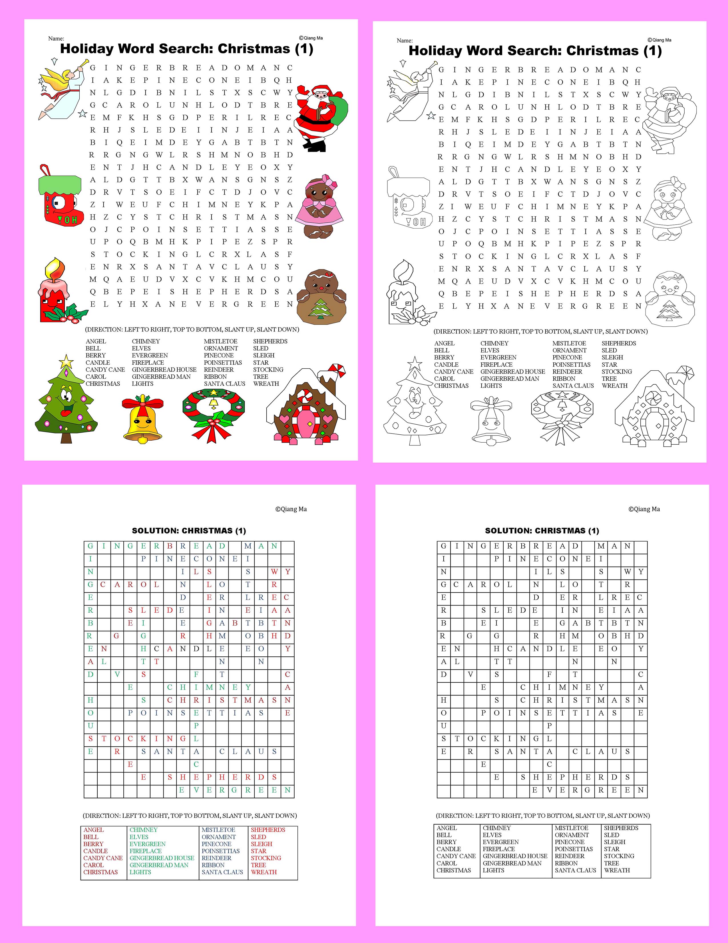Page 1: ANGEL, BELL, BERRY, CANDLE, CANDY CANE, CAROL, CHRISTMAS, CHIMNEY, ELVES, EVERGREEN, FIREPLACE, GINGERBREAD HOUSE, GINGERBREAD MAN, LIGHTS, MISTLETOE, ORNAMENT, PINECONE, POINSETTIAS, REINDEER, RIBBON, SANTA CLAUS, SHEPHERDS, SLED, SLEIGH, STAR, STOCKING, TREE, WREATH