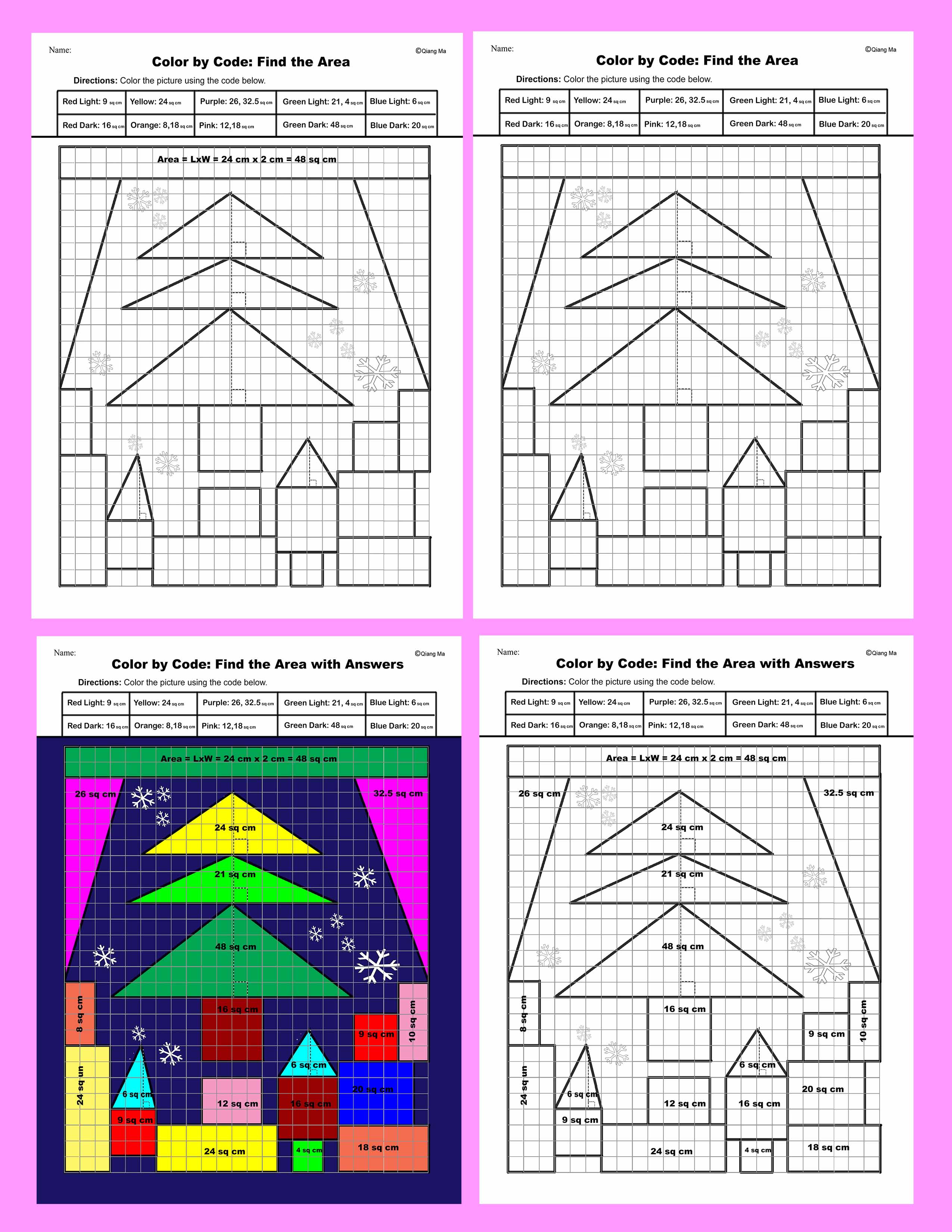 Find the area and perimeter of squares, rectangles, and triangles by using geometry formulas. 40 problems total. 2 sets. Each set has 20 problems, 1 blank student worksheet, 1 student worksheet with one sample answer, 1 teacher answer sheet in color, and 1 teacher answer sheet in ink. Grade 3-10. Use for Christmas, or any time of the year. Prep Free! Independent!